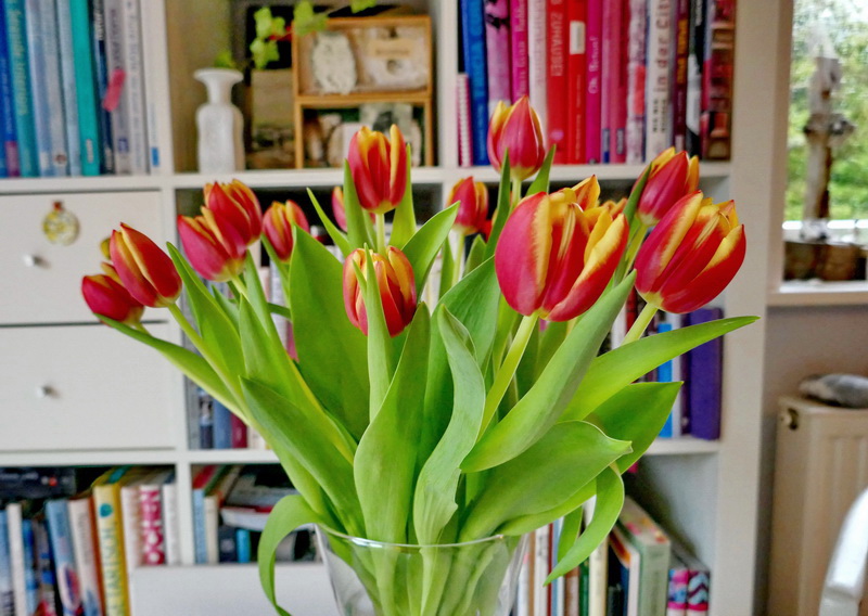 ein paar tage zuvor leuchtete ein dicker strauß von ihnen noch vor dem bunten bücherregal - der graue himmel hatte mich zum kauf verführt!